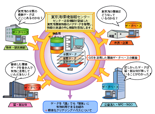 このような取り組みの中心を担う機関として、「東京湾環境情報センター」を“東京湾に関連する情報を有機的に連携するための基盤”と位置付け、環境データの管理とともに、環境データの“クリアリングハウスとして機能”させることを目指します。